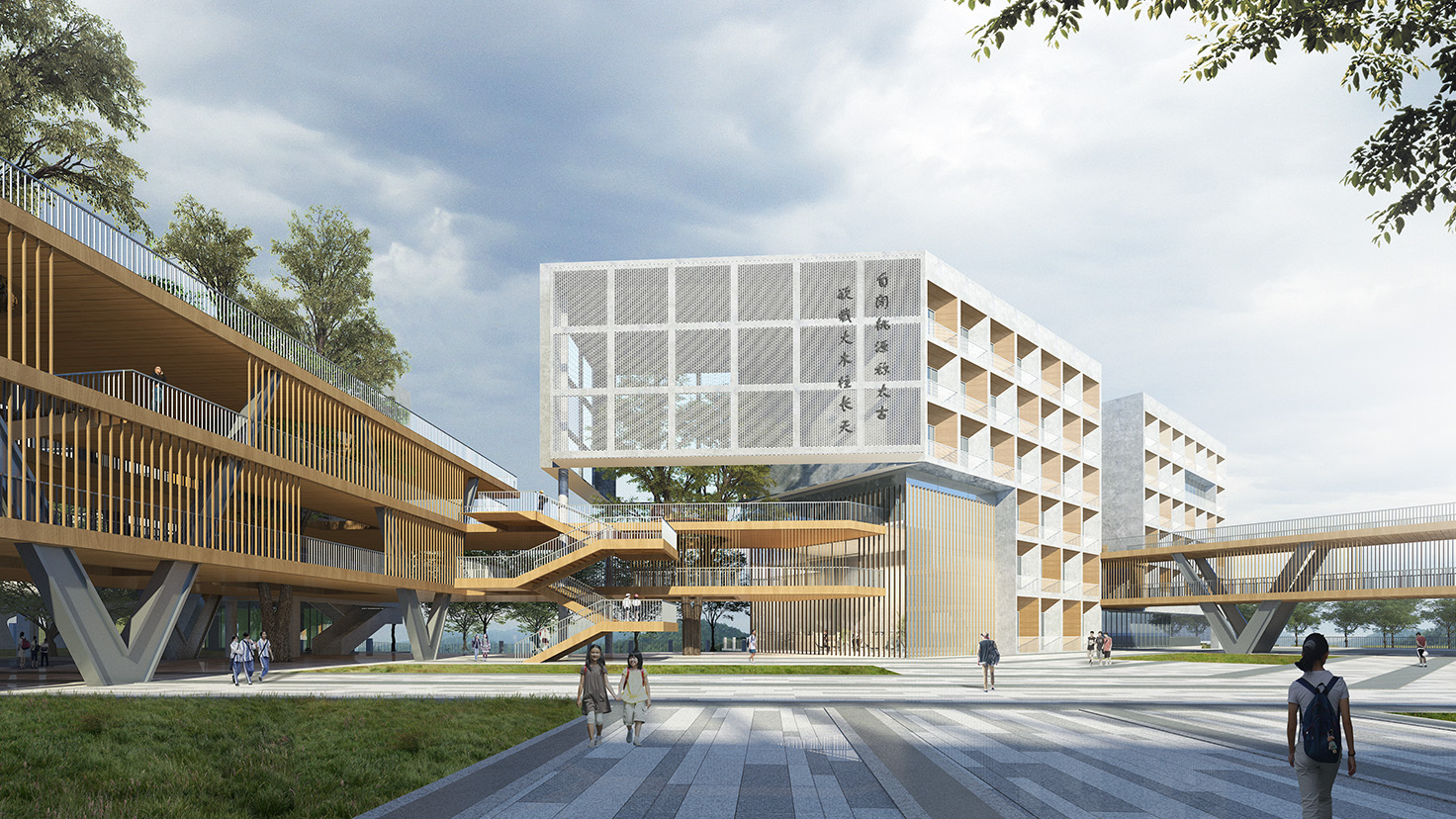 設(shè)計(jì)背景:楊昌濟(jì),后世稱“板倉先生”,一生致力于教書育人,培養(yǎng)出毛澤東、蔡和森等一批國家棟梁之材。其作聯(lián)“自閉桃源稱太古,欲栽大木柱長天”正是其一生理想。 本次設(shè)計(jì)由板倉先生的理想出發(fā),“欲栽大木柱長天”,“木”是中國教育的開始,至圣先師孔子便是在樹下為門下弟子傳道授業(yè)。讓樹木在建筑中生長,打造板倉先生理想中的教書育人的“桃源”。 由于學(xué)校各建筑功能的豐富性以及獨(dú)特性,我們將建筑進(jìn)行人為的動(dòng)靜分區(qū)以保證其良好的教學(xué)秩序,但是各功能區(qū)通過連廊相連接,圍合成多變的組團(tuán)空間,不同尺度的內(nèi)庭院相串聯(lián),營造出安靜、舒適的教學(xué)與活動(dòng)環(huán)境。