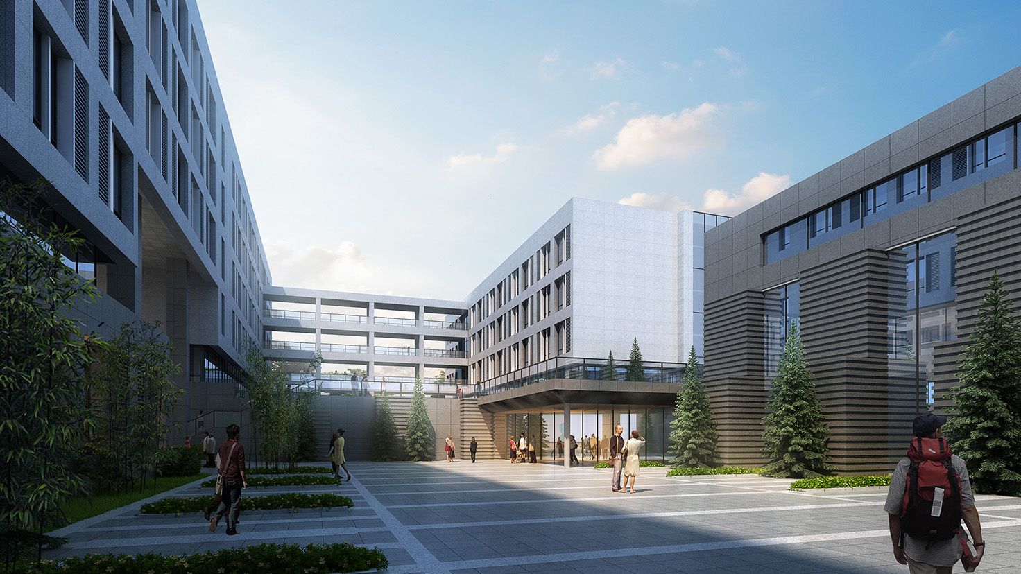 設(shè)計背景:我們采用地形同構(gòu)的手法來雕琢地信樓的形體和空間,深灰色的莊勝礦業(yè)研究院與架空平臺一起組合成了一個大的基座,借助二層玻璃體塊的過度,兩個紅色的盒子從基座上悠然生長開來,內(nèi)部豐富的空間借助統(tǒng)一的基座整合到了一起,使得建筑的形體豐富又不失完整。剛毅的外表,柔軟的內(nèi)在,恒久的色彩和肌理,這便是我們心中地信學(xué)子的校園。